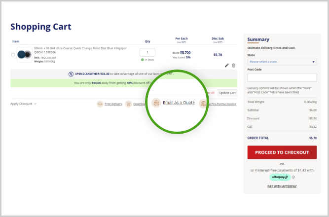 Making Changes to a Quote: If you need to make any changes to the quote, after clicking on "Click to Place Order" your cart will have the items on your quote. You can now add / remove items or change qty's. You can also see the available freight options for your post code.